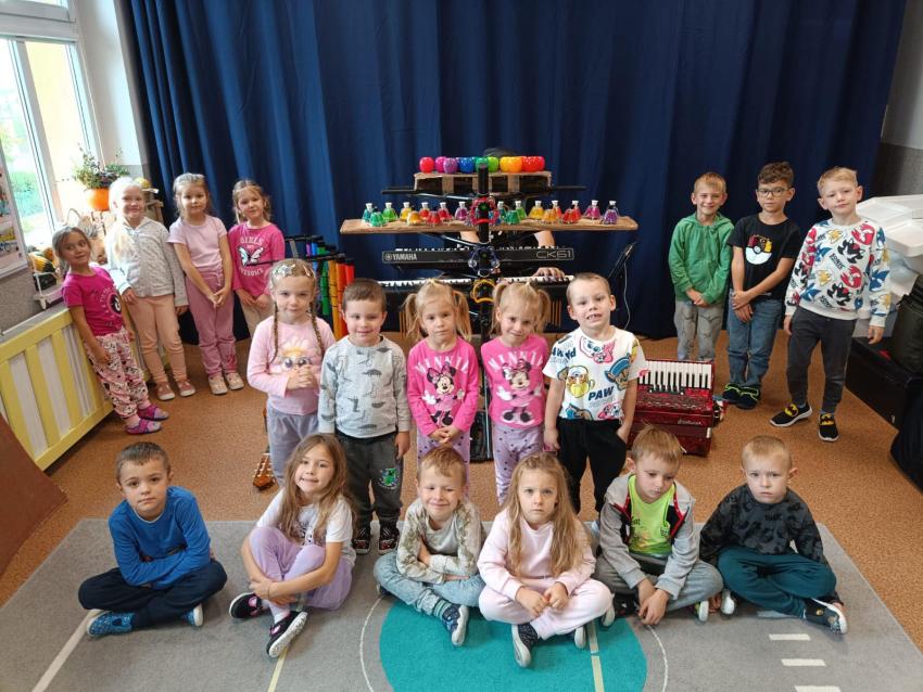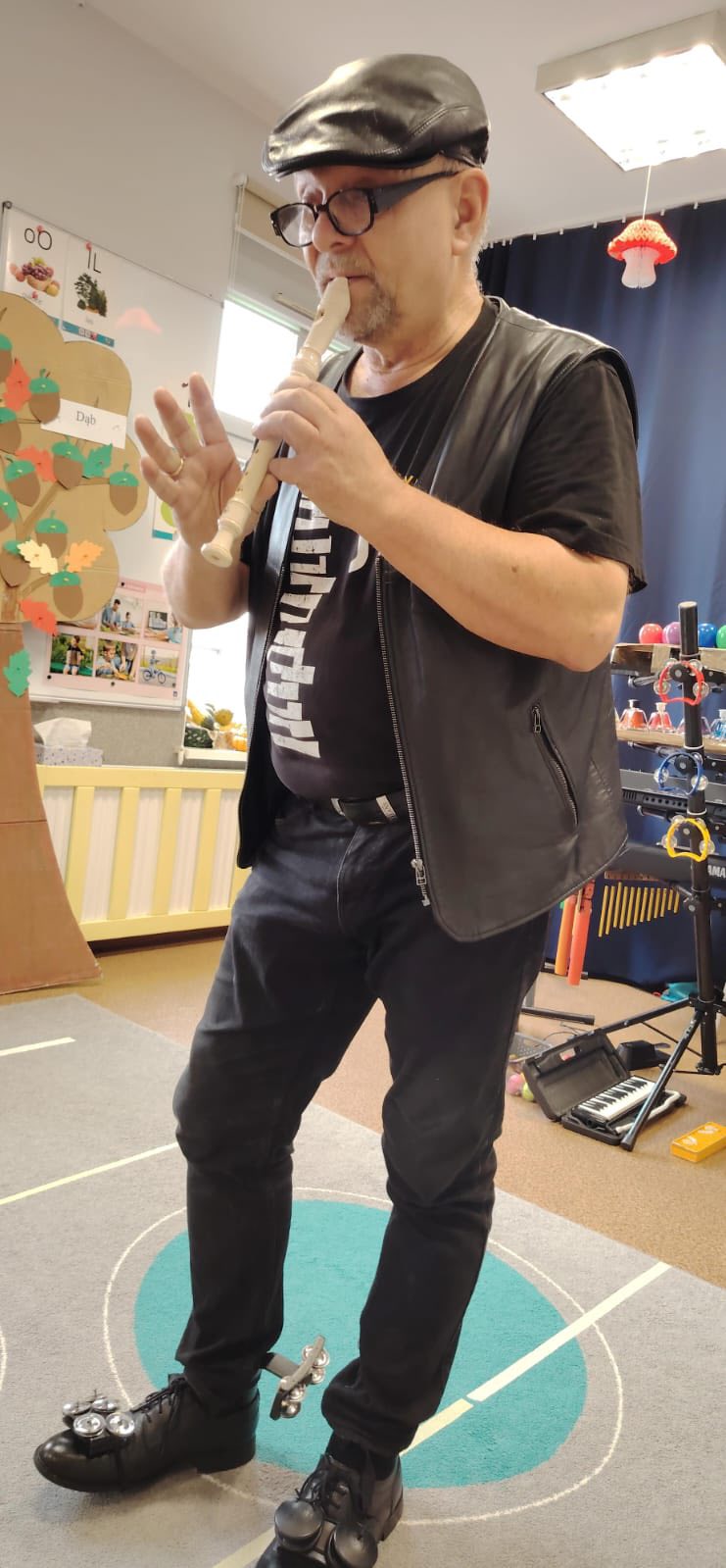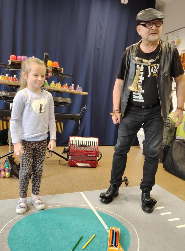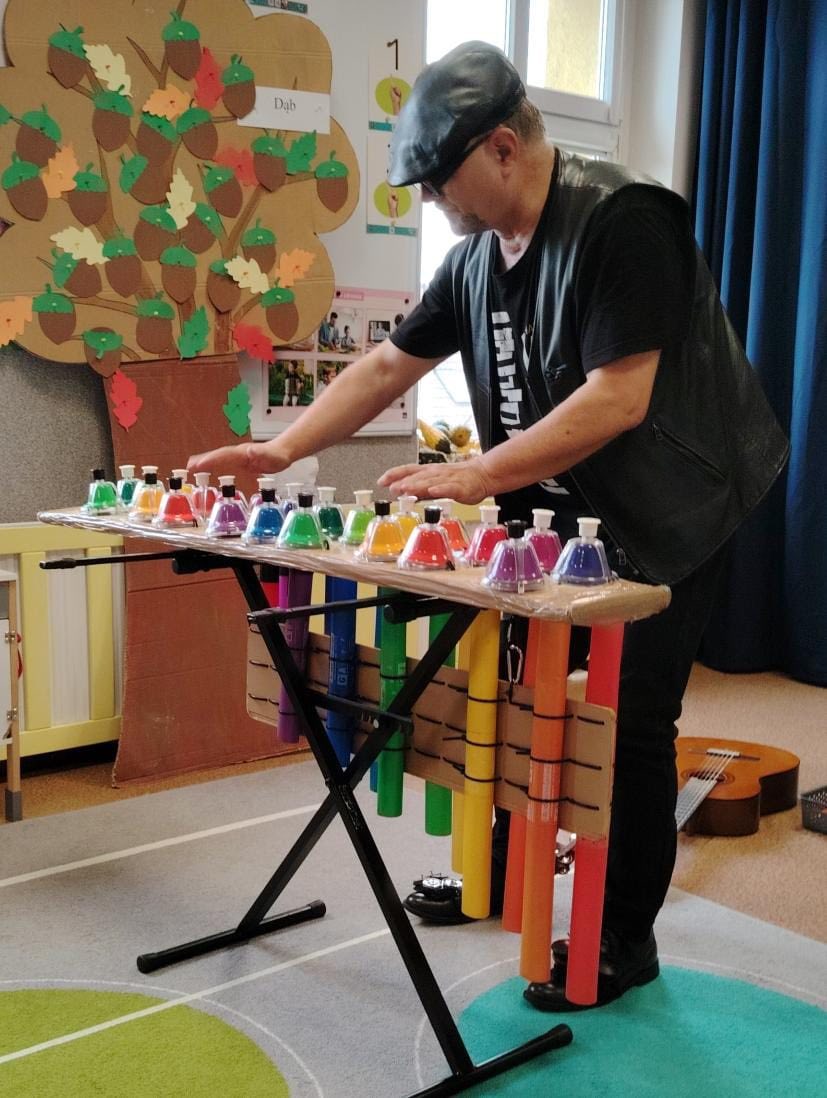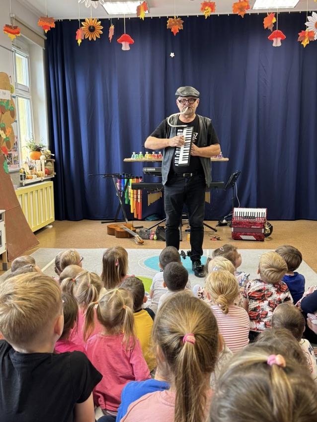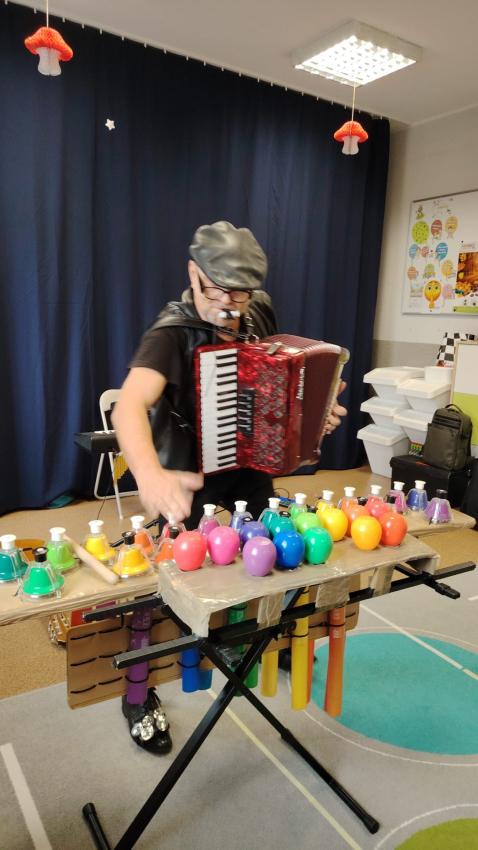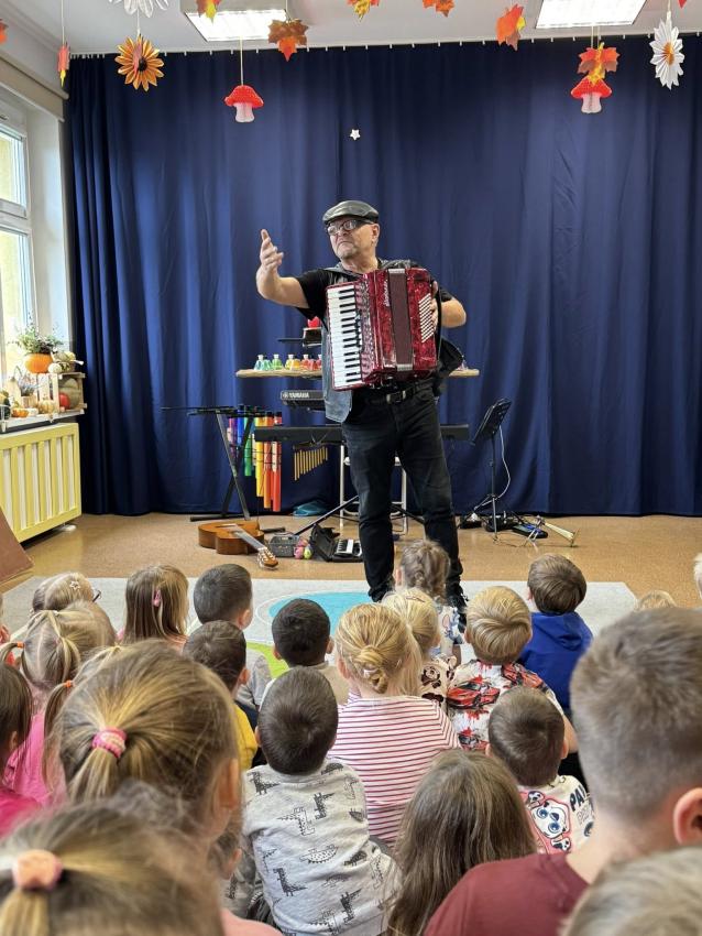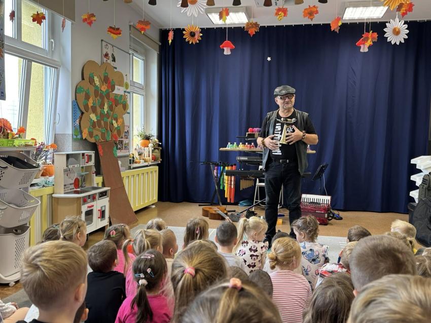 Pan Wiesław z wielką pasją opowiadał o muzyce i pokazywał, jak można tworzyć dźwięki z pozornie zwyczajnych przedmiotów. Dzieci miały okazję nie tylko słuchać, ale także wspólnie muzykować ? klaskały, śpiewały i rytmicznie wystukiwały melodie razem z naszym gościem.