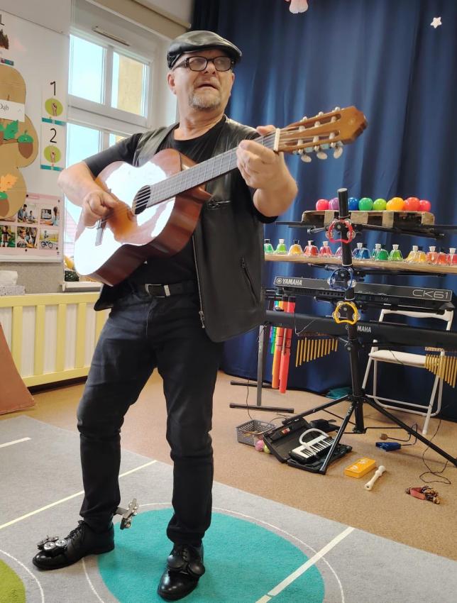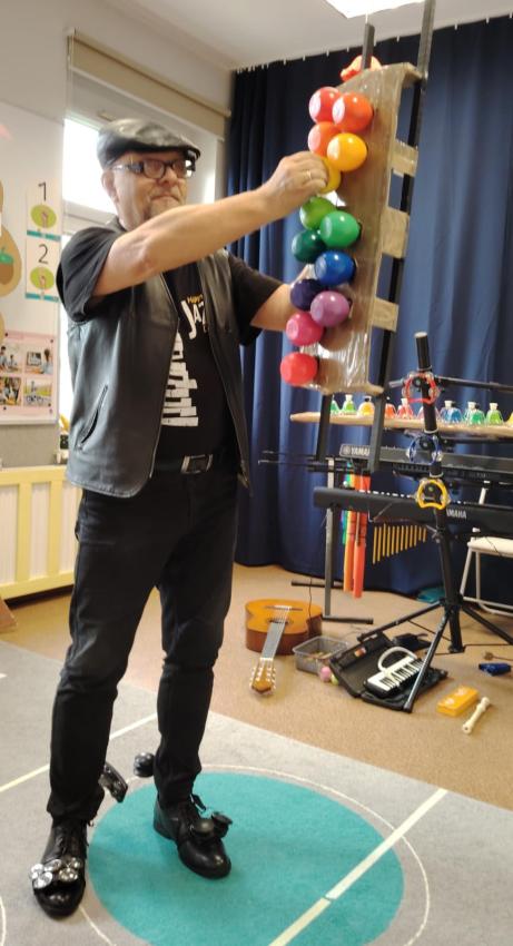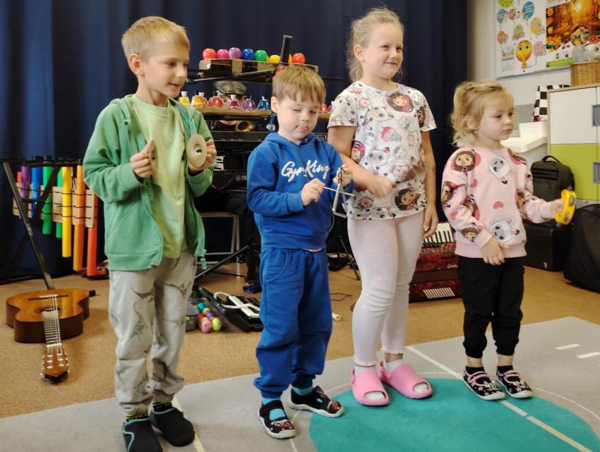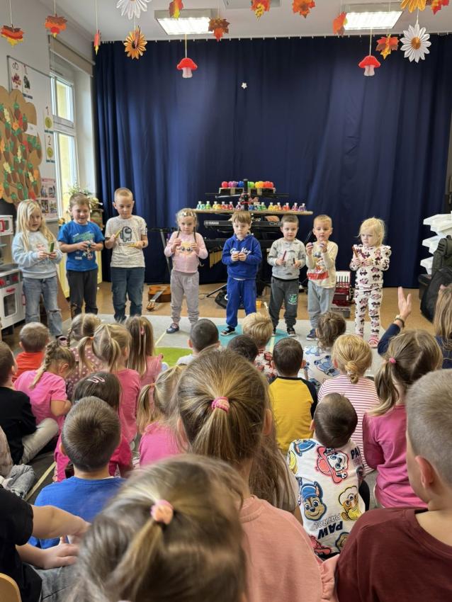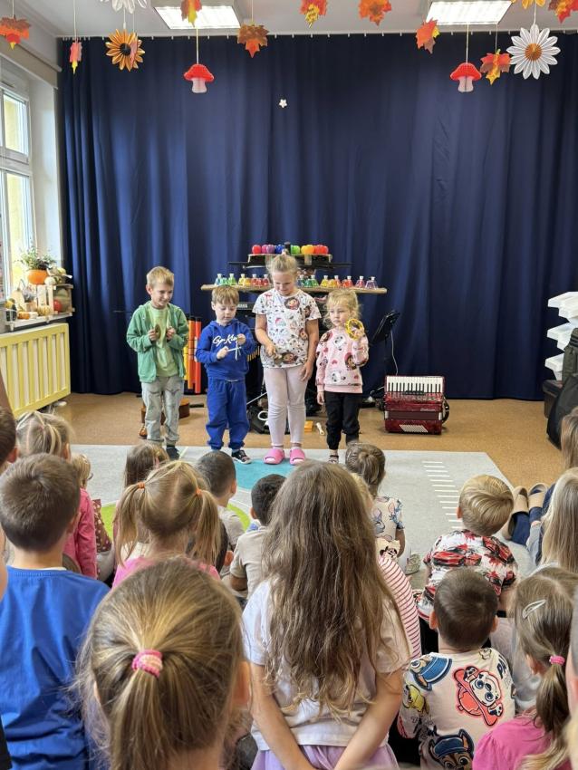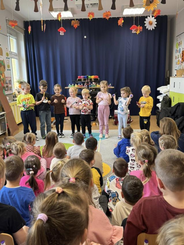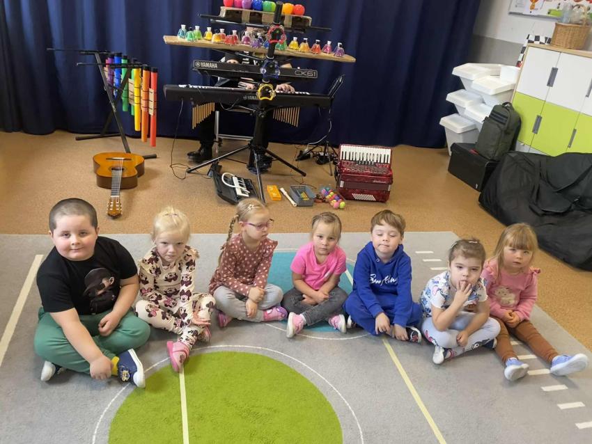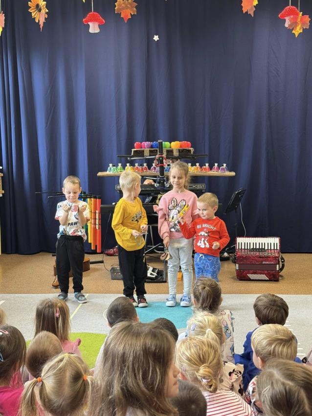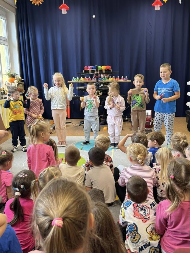 Pan Wiesław z wielką pasją opowiadał o muzyce i pokazywał, jak można tworzyć dźwięki z pozornie zwyczajnych przedmiotów. Dzieci miały okazję nie tylko słuchać, ale także wspólnie muzykować ? klaskały, śpiewały i rytmicznie wystukiwały melodie razem z naszym gościem.