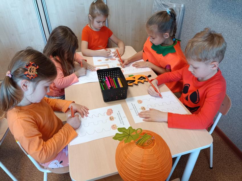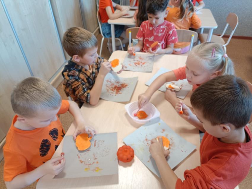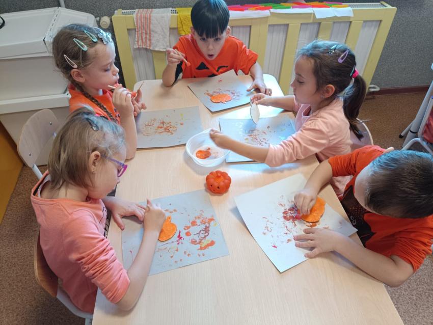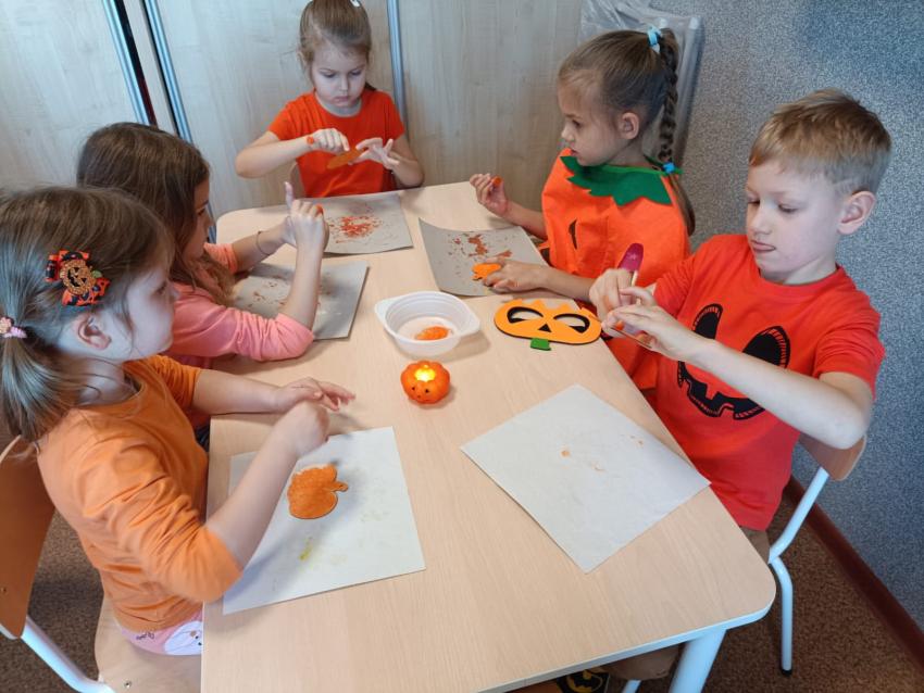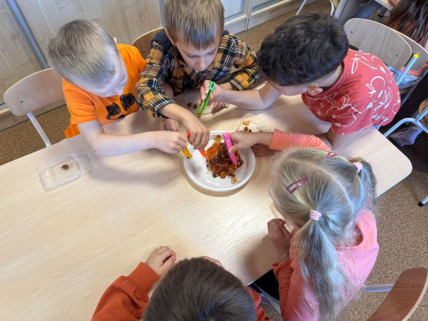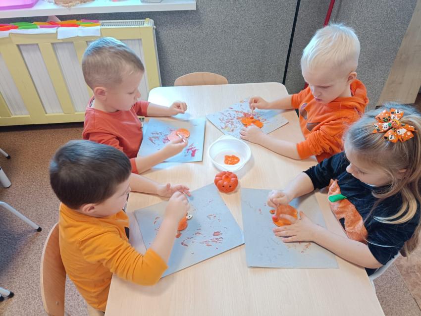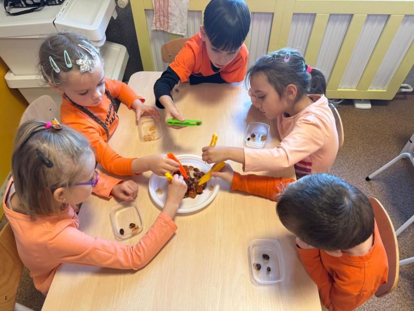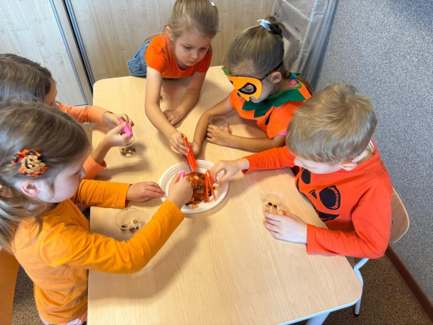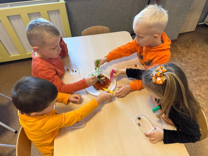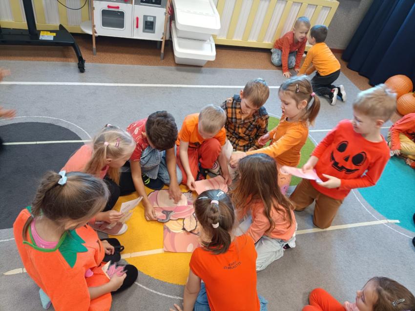Na początku dzieci stworzyły dynie z kawałków puzzli, a następnie uczestniczyły w zajęciach sensoplastycznych, podczas których w dyniowych galaretkach poszukiwały ukrytych skarbów przy pomocy pęset