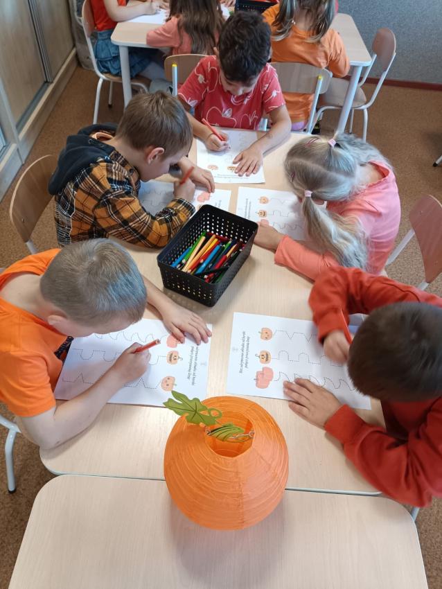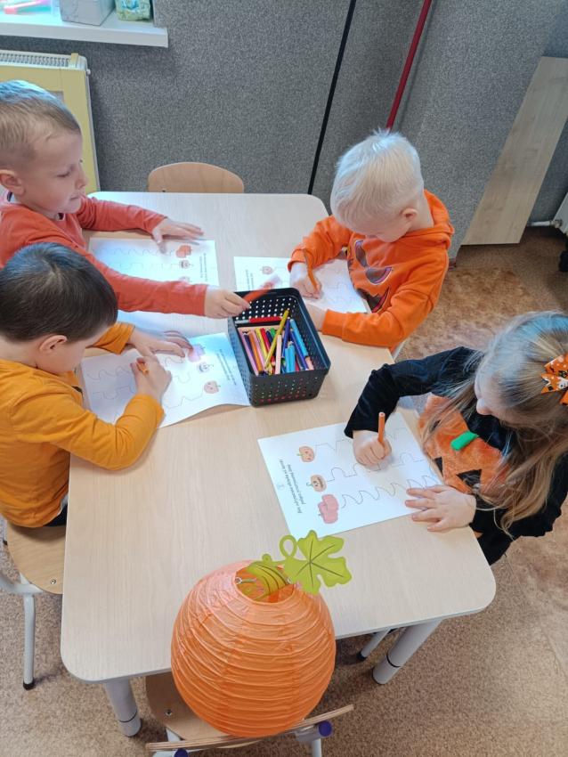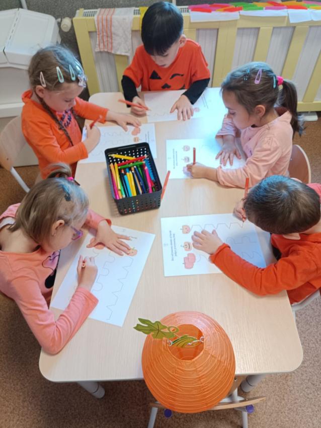 Nie zabrakło też ćwiczeń grafomotorycznych ? małe rączki dzielnie pracowały, malując i ozdabiając drewniane dynie