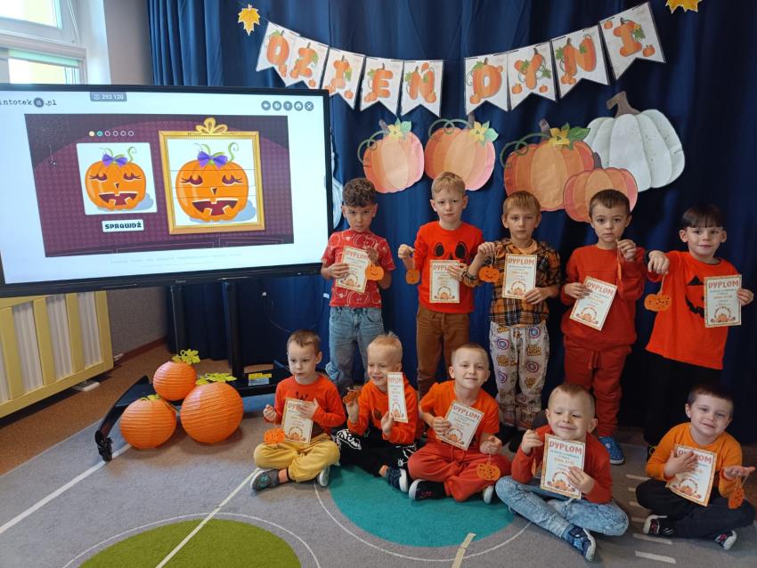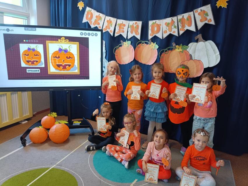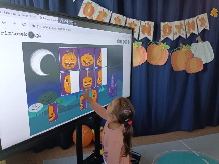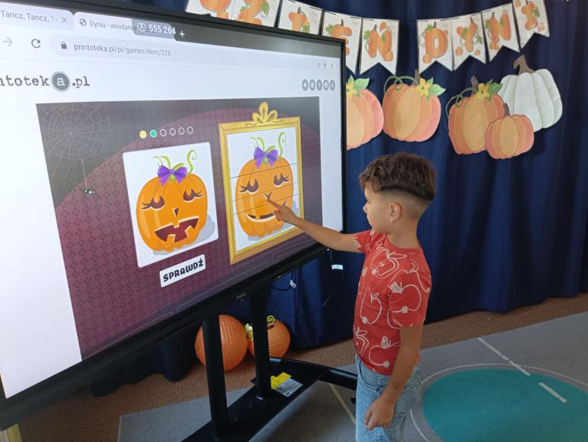 Na zakończenie dnia Żabki rozwiązywały dyniowe zadania przy tablicy multimedialnej, świetnie się przy tym bawiąc i ucząc!