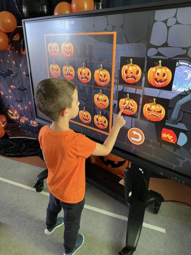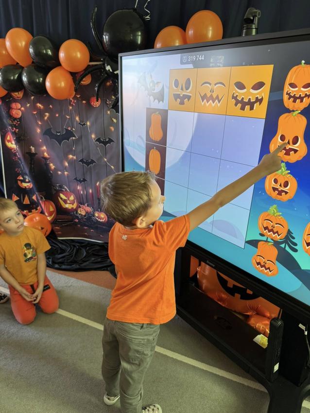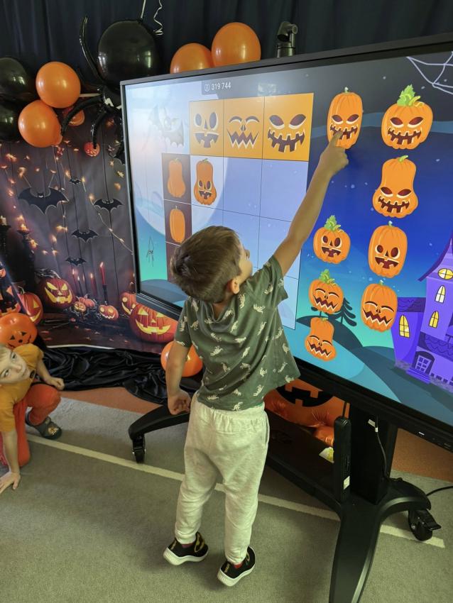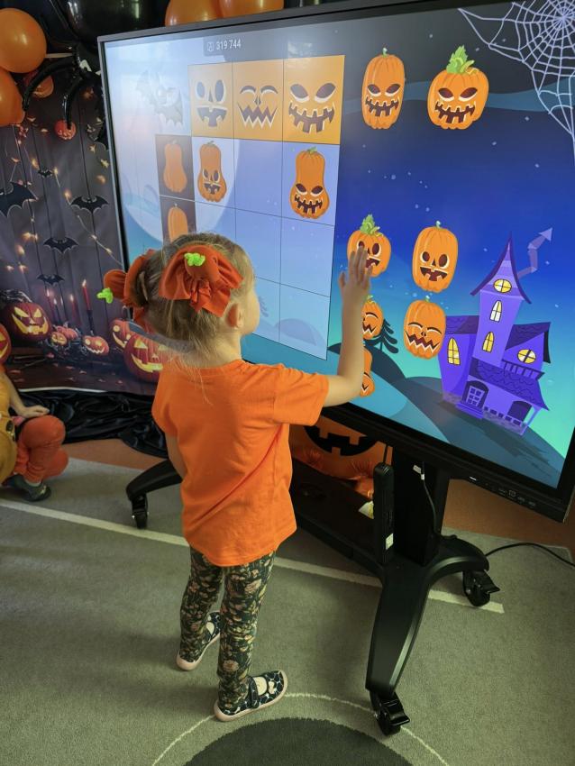 Dużo radości sprawiło nam także wykonywanie dyniowych zadań na tablicy multimedialnej ? dzieci z zaangażowaniem rozwiązywały jesienne zagadki i łamigłówki.