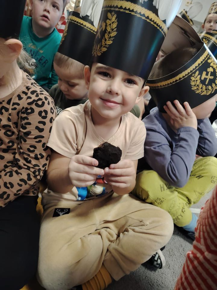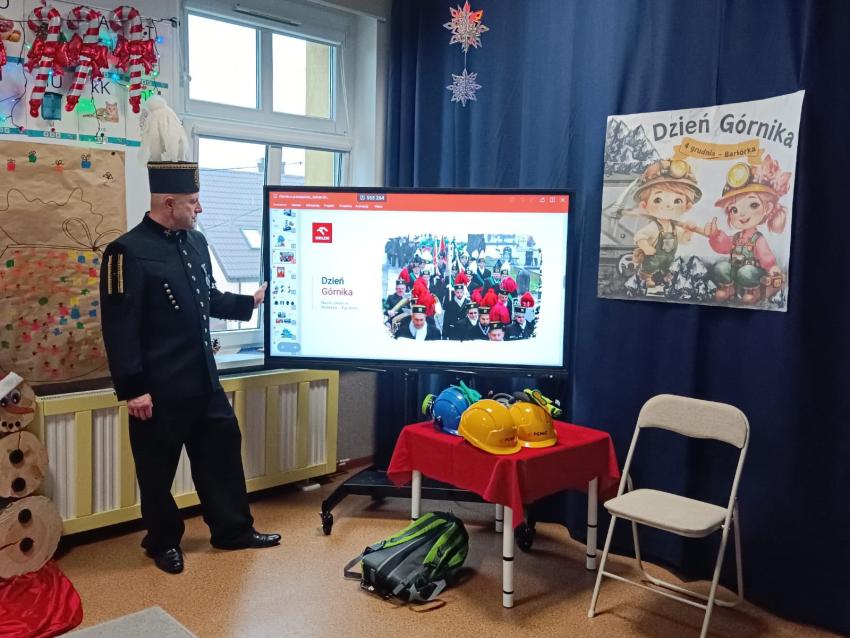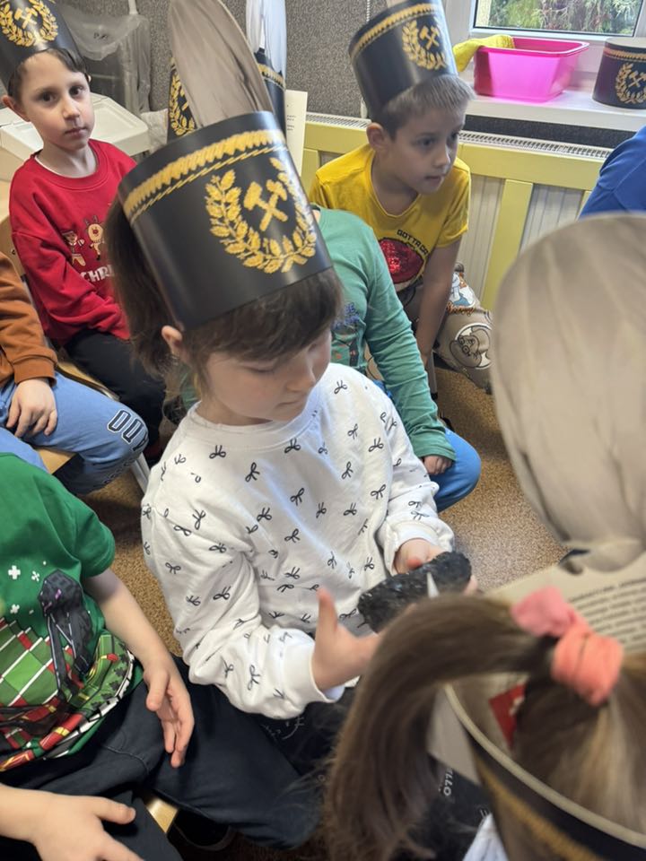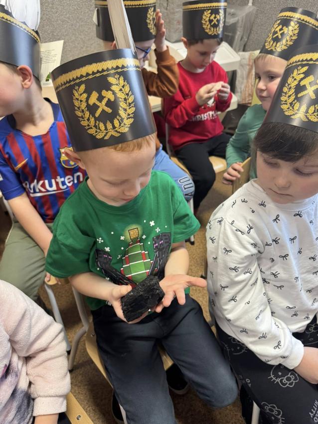 Dużym zainteresowaniem cieszyła się górnicza czapka ? czako. Pan Grzegorz wyjaśnił, skąd wzięła się jej charakterystyczna forma, co oznaczają kolory pióropusza oraz kiedy górnicy zakładają to wyjątkowe nakrycie głowy. Dzieci mogły z bliska obejrzeć czako i dowiedzieć się, jaką rolę pełni w górniczej tradycji.